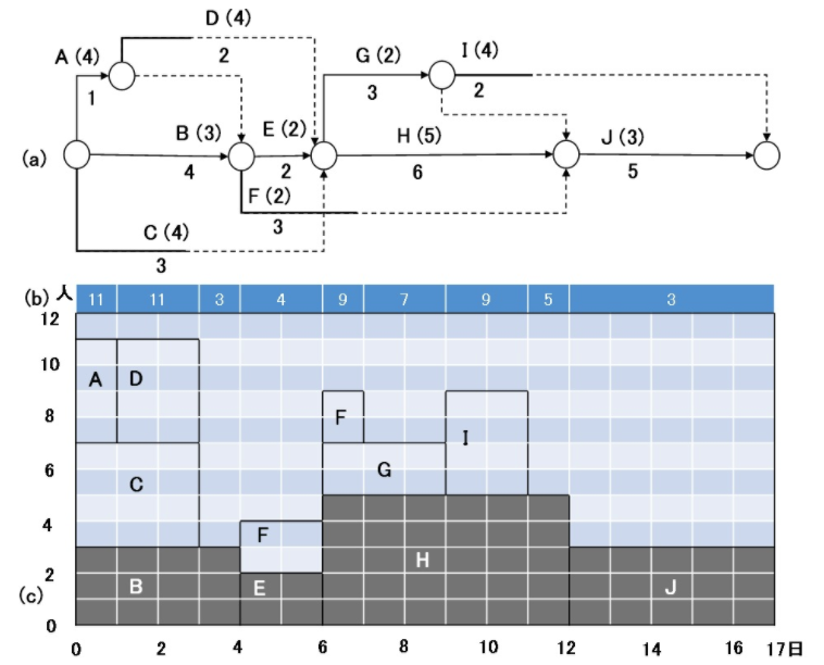 プロジェクトの現場では、技術者・作業者等にとって経済的でかつ合理的であるように各作業の作業時間及び人数等を決めます。これを、要員計画(マンパワースケジューリング)と呼びます。