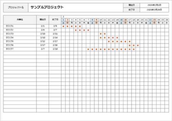より効率なスケジュール管理のためには、プロジェクトの管理者が作業の開始日や終了日、曜日、所要時間を塗りつぶしておくのがおすすめです。