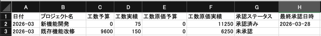 これにより、承認が完了した工数データのみを抽出して他システムへ連携したい場合や、未承認のデータが混ざっていないかのチェックが容易になります。