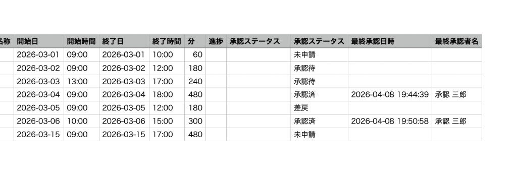 これにより、承認が完了したタイムシートデータのみを抽出して他システムへ連携したい場合や、未承認のデータが混ざっていないかのチェックが容易になります。